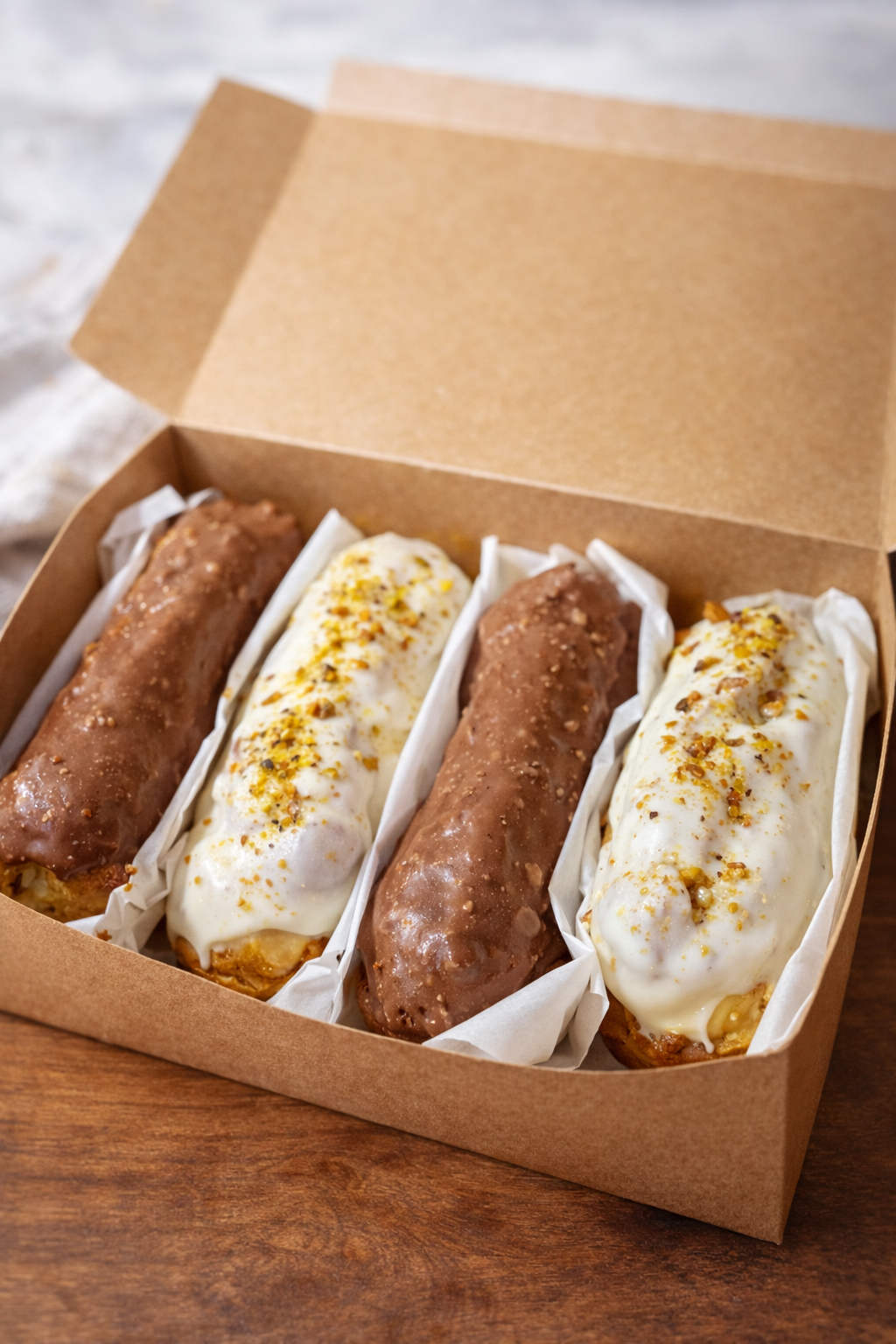 Caja de Eclair. Dos de chocolate blanco y dos de chocolate Rocher.